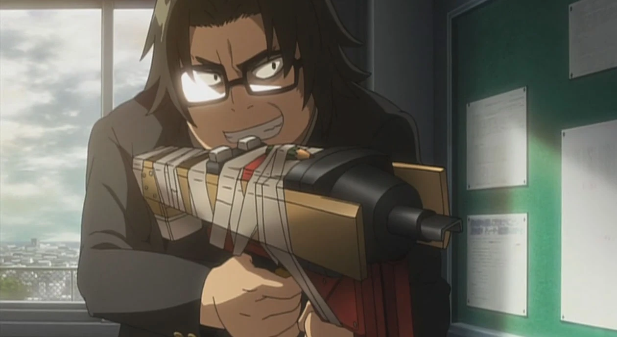 The nail gun is the first weapon used by Kohta Hirano during the initial outbreak at Fujimi Academy. It is gas-powered and able to launch nails at a speed high enough to pierce a skull at moderately close range. Kohta creates a makeshift stock and sight for the nail gun to make it more like a rifle.